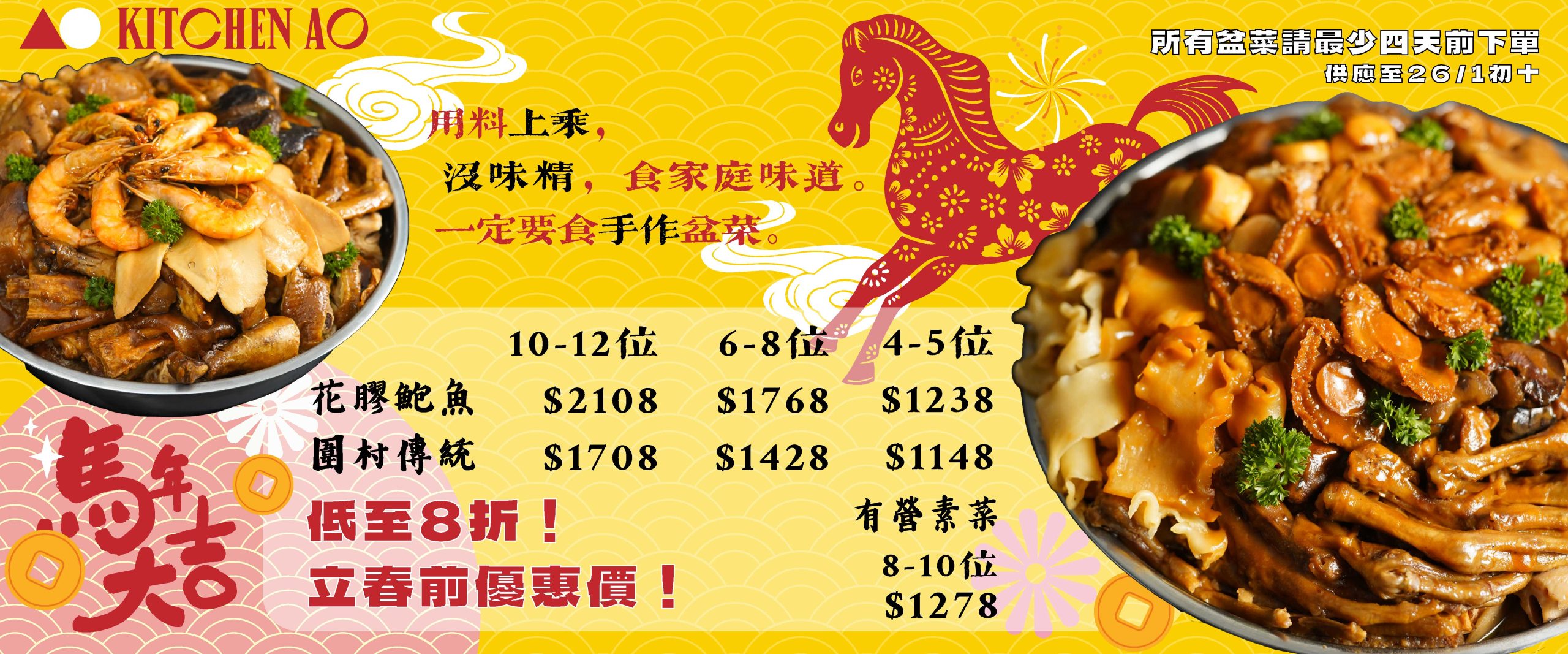 KitchenAO母親手作盆菜正式上市!由即日起至2月4日立春前下單有早鳥92折優惠。注意:訂購盤菜需於4天前下單,如有疑問請Whatsapp至客戶服務同事查詢。